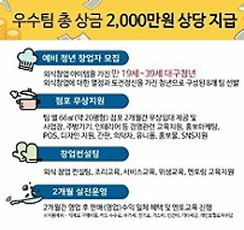 대구 지역에서 창업을 준비한다면 주목하세요! 만 19세부터 39세 대구 청년창업자들에게 좋은 기회를 제공하는 '청년 팝업 레스토랑' 참가자를 모집합니다. 참가 신청해서 당첨만 되면, 다양한 혜택을 받을 수 있습니다. 7월 20일(금) 오후 5시까지 신청 접수를 해야 하니, 꼭 참고해 주세요! 어떤 혜택이 제공되는지 알아볼까요? 점포 무상 지원 요즘 임대료 너무 비싸죠? ㅠㅠ '청년 팝업 레스토랑'에서는 2개월간 점포를 무상임대 제공합니다. 굉장하죠? ㅎㅎㅎ 더불어 주방기기, 인테리어 등도 지원하고, 창업교육 및 홍보마케팅, POS, 디자인, 간판, 의탁자, 유니폼, 홍보물 등도 지원을 한다고 하네요! 창업컨설팅 경험이 없다고 걱정할 필요가 없습니다! 외식 관련 컨설팅부터 조리 및 서비스 교육, 위생교육,..
